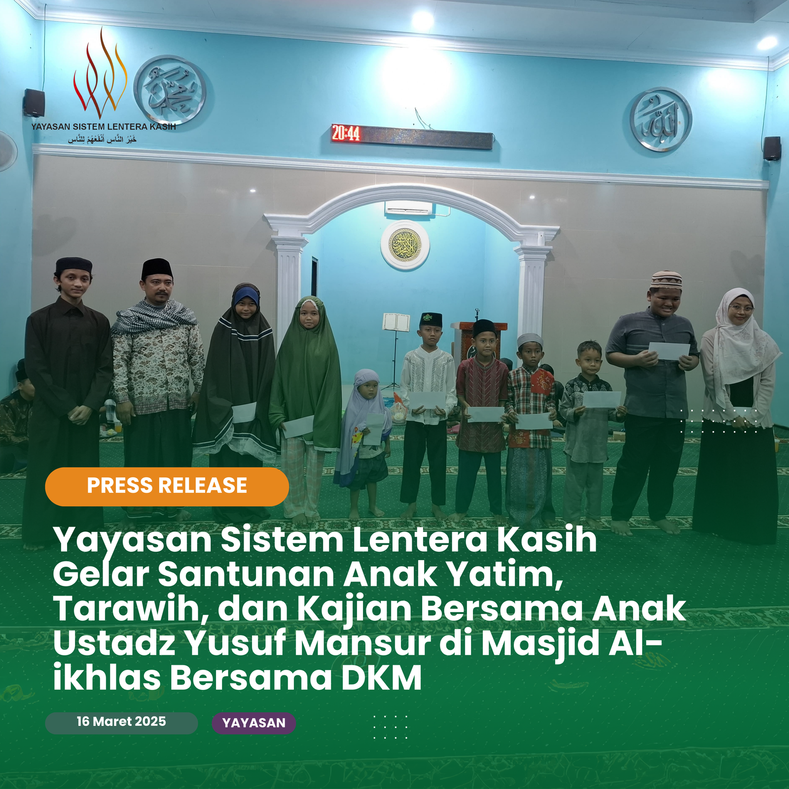 Yayasan Sistem Lentera Kasih Gelar Santunan Anak Yatim, Tarawih, dan Kajian Bersama Anak Ustadz Yusuf Mansur di Masjid Al-ikhlas Bersama